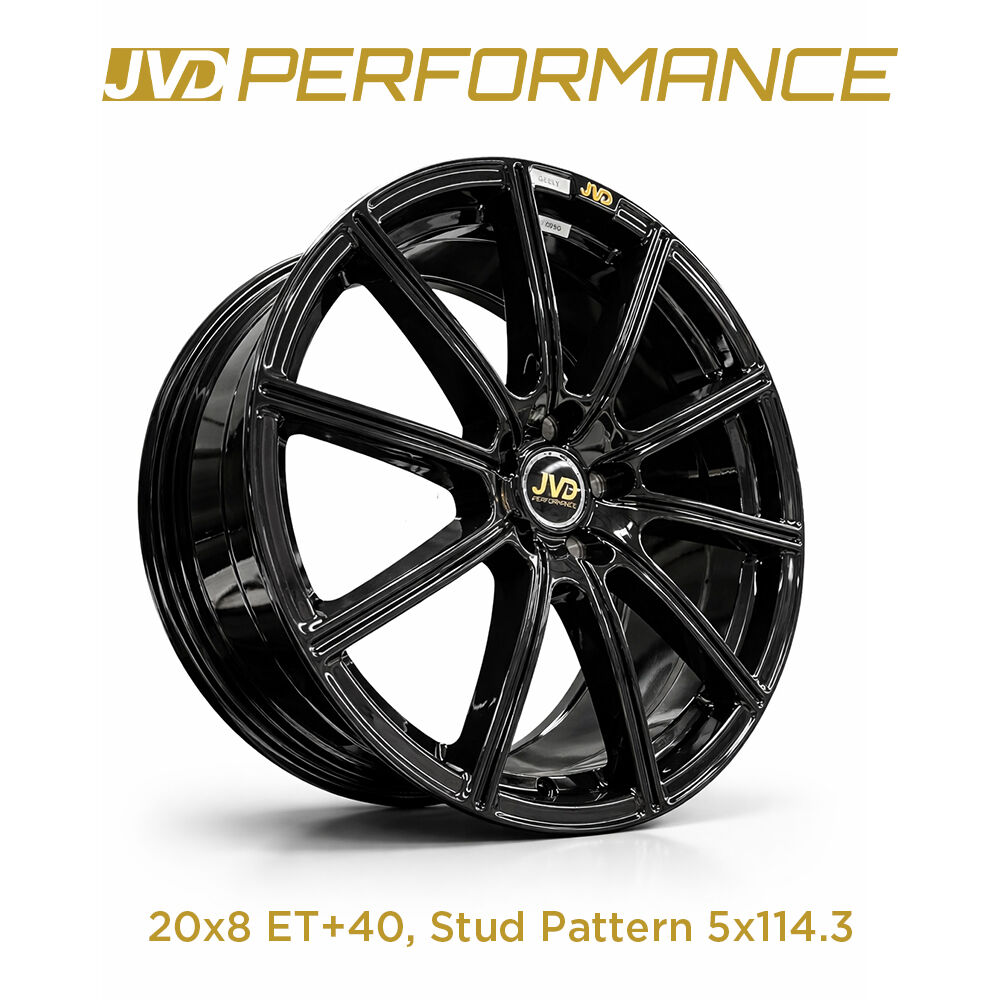 This JVD Performance wheel features a lightweight multi-spoke design finished in sleek black, drawing inspiration from motorsport racing wheels. The slender, symmetrical spokes highlight its 20x8 profile, combining elegance with performance-oriented engineering.