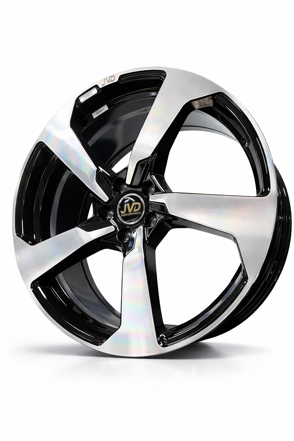 This JVD Performance wheel features a bold 5-spoke design with a sharp diamond-cut machined face contrasted by deep gloss black windows. The crisp geometric lines highlight its 21x8.5 profile, giving it a refined yet commanding look that perfectly complements modern Geely styling.