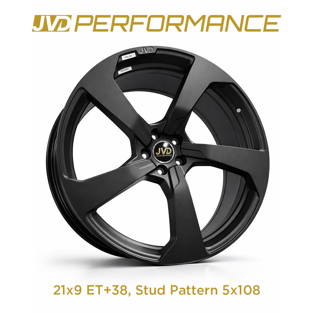 This JVD Performance V-Aero wheel features a bold 5-spoke design finished in a deep matte black for a stealthy and aggressive appearance. The wide, angular spokes emphasize the wheel’s 21x9 profile, giving it a purposeful stance that enhances both style and performance.